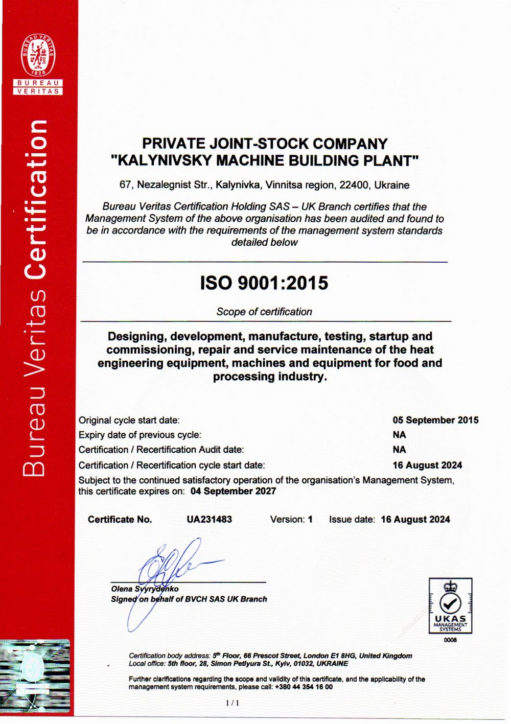 CERTIFICATE FOR CONFIRMATION OF THE QUALITY SYSTEM OF WELDING PRODUCTION DSTU EN ISO 3834-2: 2019 "PSC KALINIVOVSKIY MACHINE BUILDING PLANT" (28.12.2020 - 28.12.2025) | ![]() |
