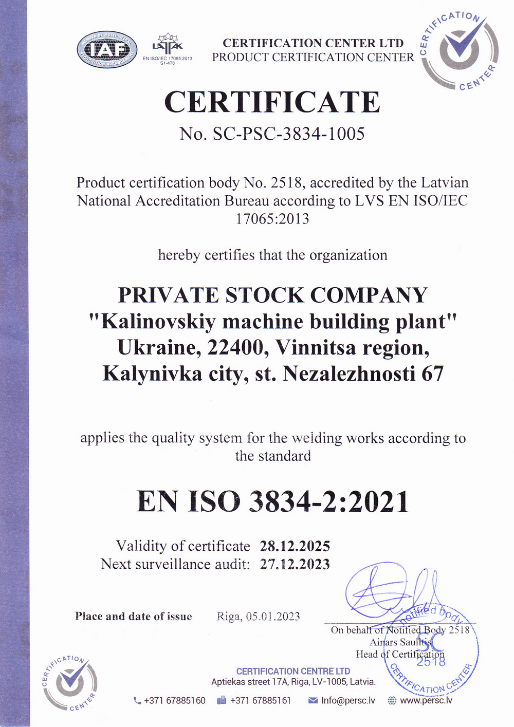 CERTIFICATE FOR CONFIRMATION OF THE QUALITY SYSTEM OF WELDING PRODUCTION DSTU EN ISO 3834-2: 2019 "PSC KALINIVOVSKIY MACHINE BUILDING PLANT" (05.01.2023 - 28.12.2025) |