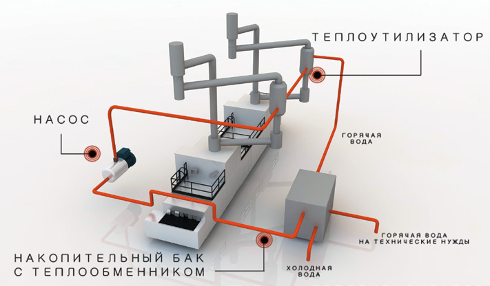 Теплоутилізатори призначені для зниження температури димових газів печі і для нагріву води. Димові гази проходячи усередині корпусу і омиваючи труби з водою, віддають їй тепло. Охолоджені димові гази викидаються в атмосферу, а підігріта вода прямує для живлення парогенератора або на технологічні потреби.