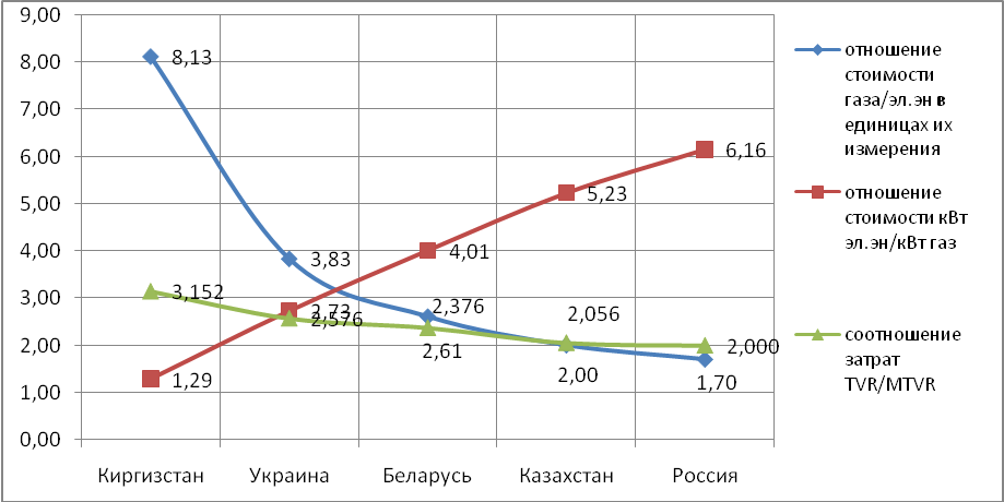 | Отношение стоимости газа/электроэнергии в единицах их измерения | 8,13 | 3,83 | 2,61 | 2,00 | 1,70 |